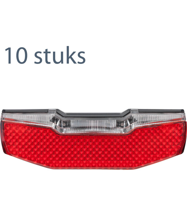 Axa achterlicht Blueline Steady 80mm dynamo, 600 meter gezien worden, 2 krachtige LEDs, Volledig verlicht door lightguide, 4 minuten licht bij stilstand, ook direct aansluiten op 6V e-bike, France homologation, Duitse StVZO goedkeur. Verpakt per 10 stuks in werkplaats doos.