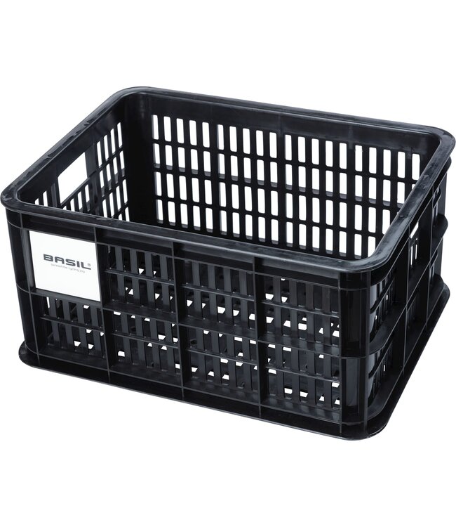 Basil fietskrat S, gerecycled kunststof, klein formaat, incl. kratclicker, geschikt voor MIK, Racktime, I-Rack, MonkeyLoad en AtranVelo platen (apart verkrijgbaar), excl. bev. materiaal, max. gewicht afhankelijk van max. toelaatbaar gewicht drager, 17.5L,black