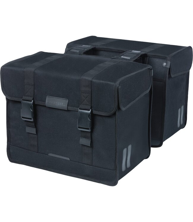Basil Kavan Eco Classic 68L dubbele fietstas, organic canvas, Bionic Eco Finish, zeer sterk, 10 jaar garantie, voorzien van regenoren, aansnoerband, Universal Bridge (geschikt voor Basil DBS, MIK, Racktime platen (apart verkrijgbaar)), reflectie, 68L, zwart