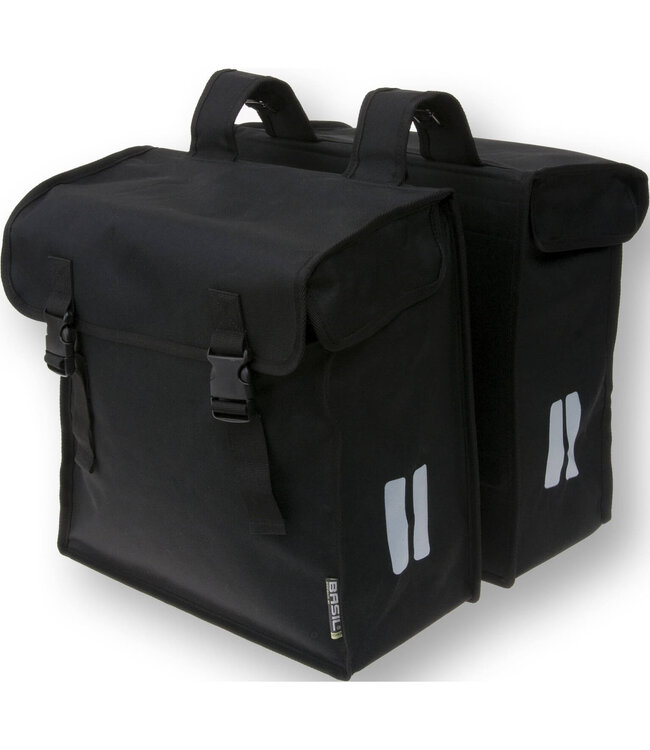 Basil Mara XXL. Dubbele fietstas van waterafstotend polyester, zeer ruim, hoofdcompartimenten zijn afsluitbaar met de band in de tas, bovenzijde twee banden t.b.v. LED/snelbinders/kinderzitje/veerklem, dubbele reflectie op alle zijkanten, inhoud: 47L, Zwart.