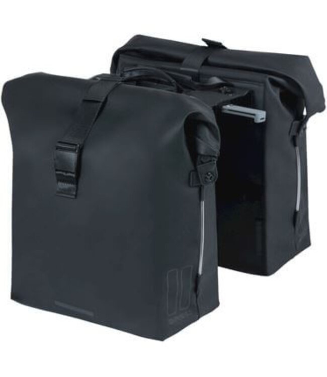 Basil SoHo dubbele fietstas Nordlicht, waterdicht (IPX3), PU, rolltopsluiting met rits, extra afsluitbaar met drukknopen, geschikt voor MIK systeemdragers/carrierplates,incl. MIK Adapterplate (70171), Nordlicht LED (excl.batt), 41L, night zwart