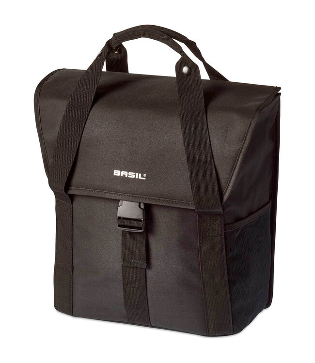 Basil Go-Single Bag. Enkele fietstas voor achterop, gemaakt van hoogwaardig materiaal, hoofdcompartiment met aansnoerkoord, dubbele elastische zijvakken, handgrepen, Hook-On System in ritsvak, dubbele en extra reflectie, inhoud: 16L, Solid Black.
