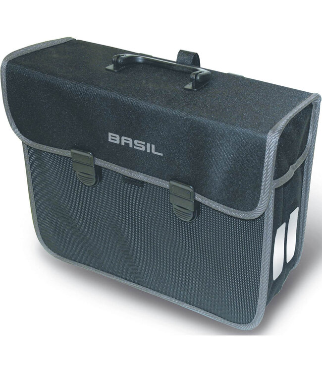 Basil Malaga. Pakaftas, gemaakt van waterafstotend 600D polyester, bevestiging aan zijkant bagagedrager d.m.v. kunststof haken, dubbele reflecterende strepen, inhoud: 13L, Zwart.