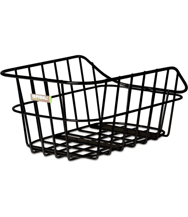 Basil Cento Alu. Designmand, weersbestendig, aluminium draad, achterop de fiets, vaste montage op bagagedrager (inclusief bevestigingsmateriaal), afgeschuind, mand wordt in lengterichting op bagagedrager bevestigd, Mat Zwart.