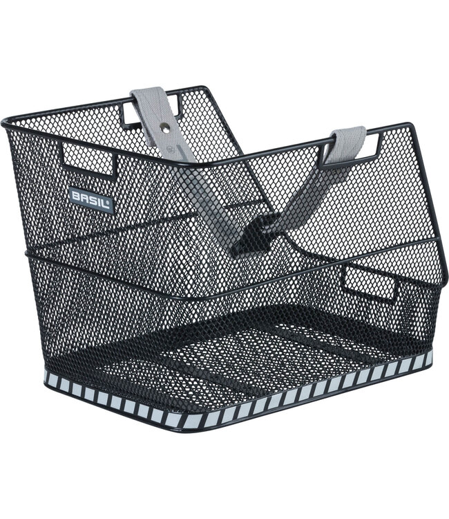 Basil Class. Schooltasfietsmand, gemaakt van staal, fijnmazig, achterop de fiets, vaste montage op bagagedrager (inclusief bevestigingsmateriaal), afgeschuind, met afneembare band om de tas te zekeren, veilige reflectie rondom, Zwart.