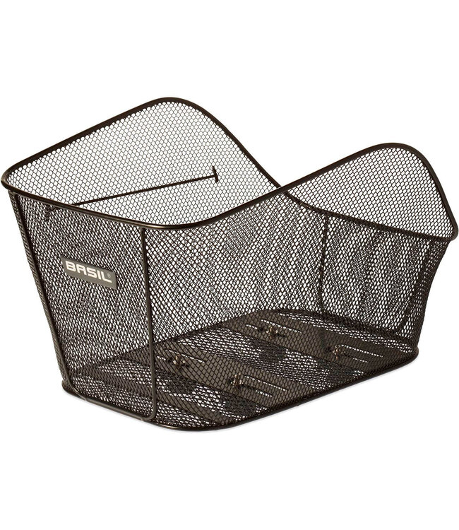 Basil Icon L. Fietsmand groot, gemaakt van staal, fijnmazig, achterop de fiets, vaste montage d.m.v. gepatenteerd WSL-systeem, eenvoudige montage, in breedte en lengte instelbaar, geschikt voor dragers verhoogde voor/achterzijde, geschikt voor veel E-bike bagagedragers, lengterichting op bagagedrager, afgeronde vorm, Zwart.