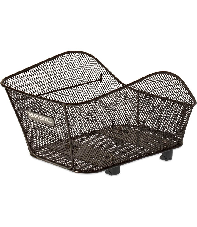 Basil Icon S. Fietsmand klein, gemaakt van staal, fijnmazig, achterop de fiets, vaste montage d.m.v. gepatenteerd WSL-systeem, eenvoudige montage, in breedte en lengte instelbaar, geschikt voor dragers verhoogde voor/achterzijde, geschikt voor veel E-bike bagagedragers, lengterichting op bagagedrager, afgeronde vorm, Zwart.