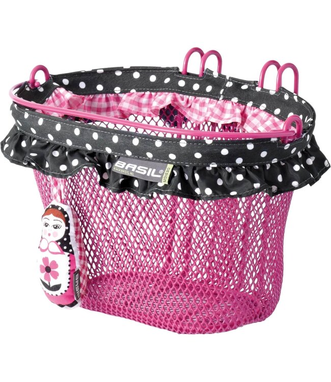 Basil Jasmin Baboushka-Basket. Kinderfietsmand voor 12-20 inch fietsen, gemaakt van staal, fijnmazig, ovaal, voorop de fiets, afneembaar, met gratis Baboushka hanger, kleurrijke versierrand, veilig dubbel uitgevoerde stuurhaken, met hengsel, Ros€??ô“€£.