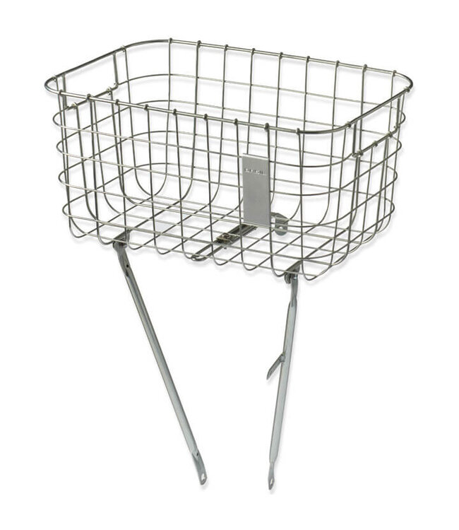 Basil Robin. Fietsmand, gemaakt van draadstaal, voorop de fiets, voor vaste montage, kroonstukmontage, ondersteuning door voorvorkbeugel (voor 12/13mm assen), max. 10 kg, past op 26 en 28 inch fietsen, Silver Cloud.