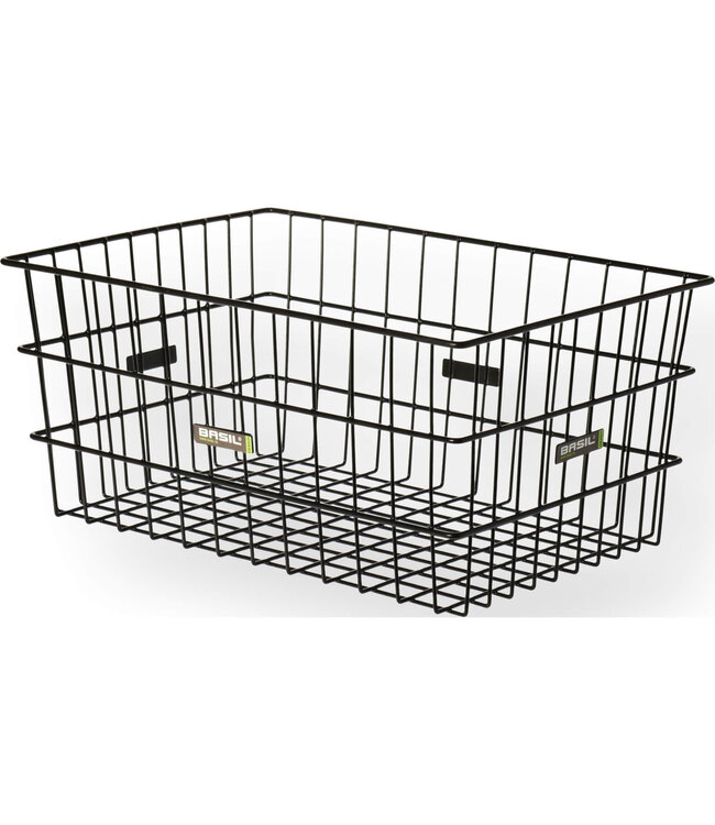 Basil ZEMBLA. Fietsmand groot rechthoekig, gemaakt van staal, draad, voor voorop of achterop de bagagedrager, wordt vast gemonteerd met bijgeleverde strips, zonder hengsel, Zwart.