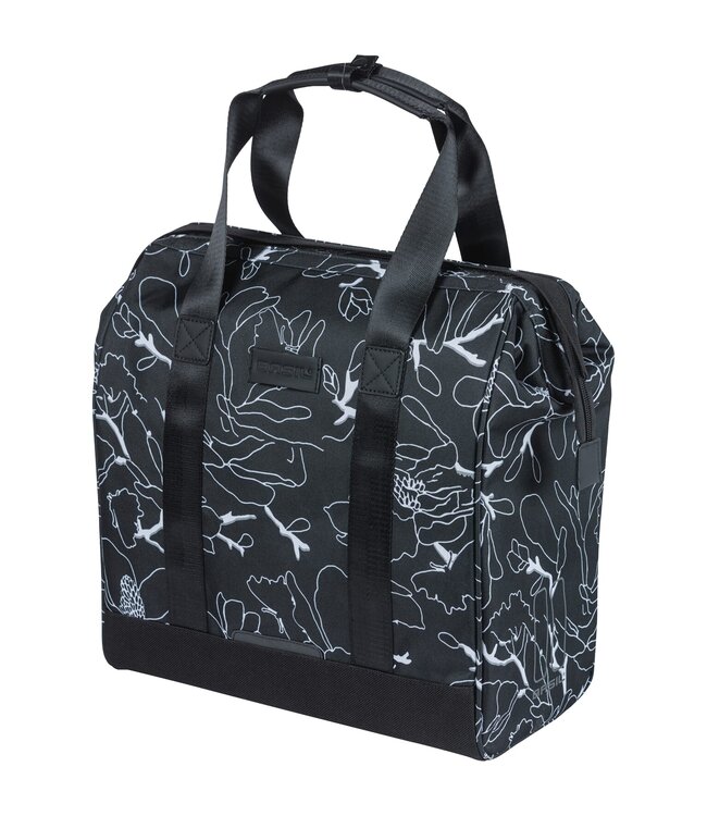 Basil Grand Flower fietsshopper, waterafstotend 600D polyester, groot hoofdvak met gepolsterd (laptop)vak, stabiele tas, met voetjes, zgn dokterssluiting, met regenwerende afwerking, handgrepen met comfortgrip, Hook On-system, ton sur ton reflectie, 23L,zwart