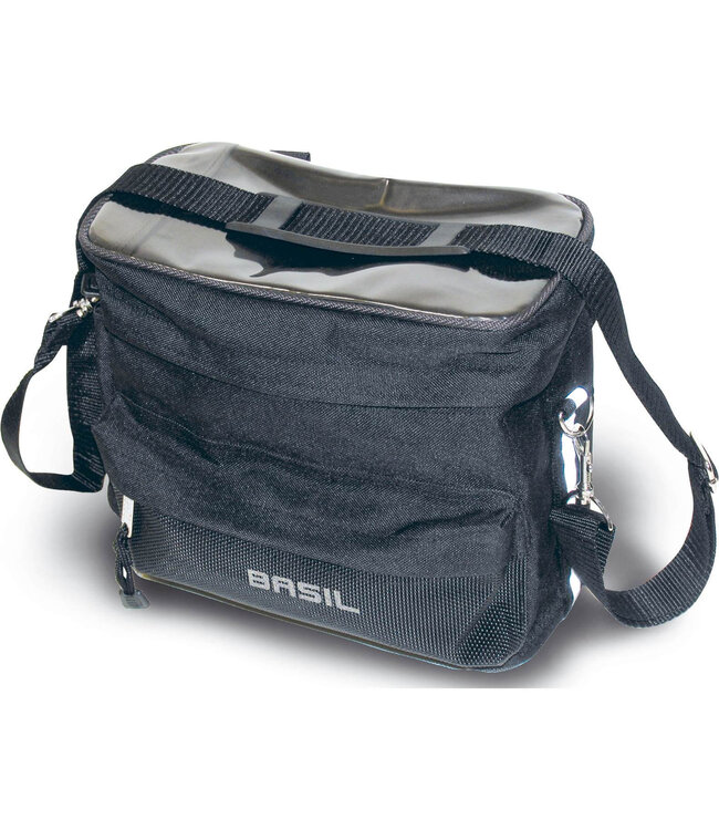Basil Mali. Praktische stuurtas, gemaakt van waterafstotend 600D polyester, afneembaar, met kaartleesvenster, afneembare draagriem, vak voor GSM/draagriem, afsluitbaar deksel, extra afsluitbaar voorvak, bevestiging aan elk stuur d.m.v. klittenband, inhoud: 8L, Zwart.