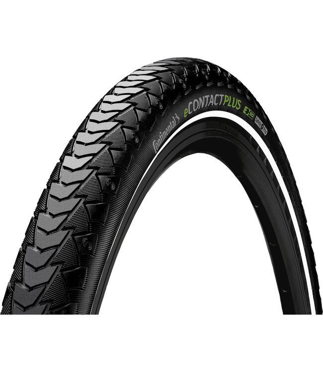 Contintental buitenband eContact Plus 20 x 2.20 kleur zwart, met reflectie. Speciaal ontwikkeld voor het woon-werkverkeer en de belasting van e-bikes. Deze band met hoge kilometrage heeft een compact loopvlakpatroon om de rolweerstand laag te houden, waardoor het bereik van elke batterijlading wordt vergroot. Dankzij het unieke loopvlak en de vooruitgang van de Continental-constructietechnologieën biedt de eContact Plus een bijzonder hoge bescherming tegen spijkers, glas en grotere gevaren.