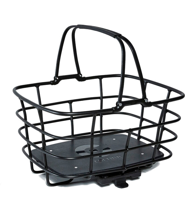Cortina Multimand Manchester AVS zwart. Metalen rechthoekige mand met kliksysteem geschikt voor het AtranVelo System (AVS) en passend op de Cortina Common voor- en achterdrager en de E-Octa achterdrager. Met soft grip handvatten in mat zwart. Gemaakt van licht aluminium en bodemplaat voorzien van Cortina logo. De mand is geschikt als draagmand voor bijvoorbeeld boodschappen. In combinatie met de cover (CA152121) en de inlay (CA152032) te gebruiken om je huisdier te vervoeren op de fiets. Afmetingen lxbxh 43x32x26cm. Indien de drager niet is voorzien van het AVS systeem dan moet er gebruik gemaakt worden van de AVS adapter (bij te bestellen met AVS174941).