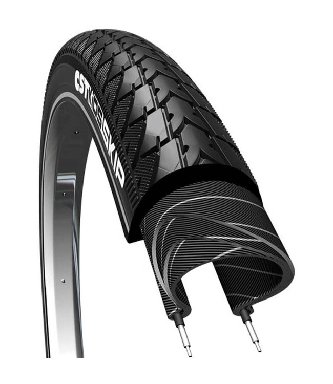 CST buitenband Skip R Zwart 16x1.75/47-305. De Skip is een typische kinderband voor kinderfietsen en jong volwassenen die niet van de harde paden afwijken. Voor gebruik op de vlakke weg en uitermate geschikt voor stadsfietsen met een sportieve uitstraling.