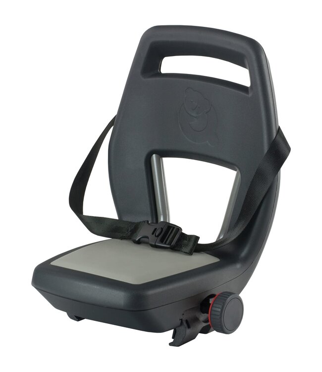 Qibbel Junior 6+ zitje antraciet met grijs kussentje, compleet met voetsteuntjes en gordel, geschikt voor bagagedragers van 11 tot 17 centimeter breed en met een buisdiameter van 10 tot 22 millimeter.