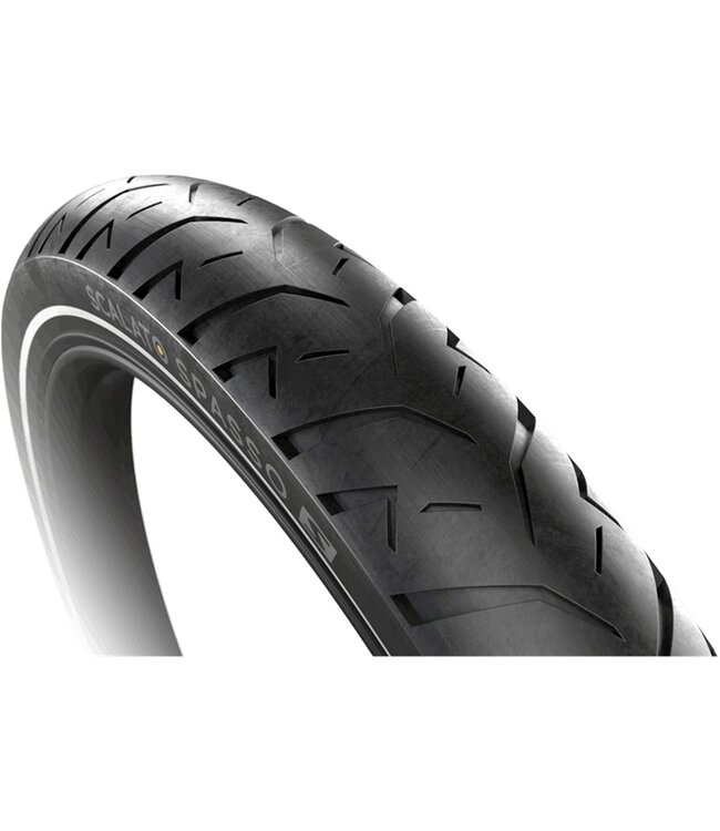 Scalato buitenband Spasso S 27.5 x 2.40 met reflectie in de kleur zwart is perfect geschikt voor snelle E-bikes. De geavanceerde Spasso-band geeft een gewichtloos gevoel en betere tractie en grip in de bochten.