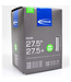 Schwalbe binnenband Freeride 27.5x2.50 Auto - AV21F/54-584, 57-584, 60-584, 62-584, 65-584, 70-584, 75-584.De Schwalbe binnenbanden zijn betrouwbaar. Fietsdetaillisten waarderen hem om zijn hoge betrouwbaarheid. Iedere band wordt in de fabriek opgepompt en zo 24 uur op luchtdichtheid getest. De band houdt de luchtdruk langer vast. In de productie vereist Schwalbe een zeer hoog butyl aandeel en een zeer hoge reinheid van het materiaal. Zo houdt de Schwalbe binnenband de luchtdruk beduidend langer vast dan andere binnenbanden. Het is een groepen-binnenbandsysteem: Een Schwalbe binnenband is extreem elastisch en past op meerdere bandafmetingen. Hierdoor worden ze groepen binnenbanden genoemd. Zo past bijvoorbeeld de binnenband met nummer 19A voor bandafmeting van 27.5 inch tot 29 Inch en voor de breedte van 40 tot 62mm. Als laatste is de band 100% volledig recyclebaar. Freeride-uitvoering: Groot volume, gering gewicht.