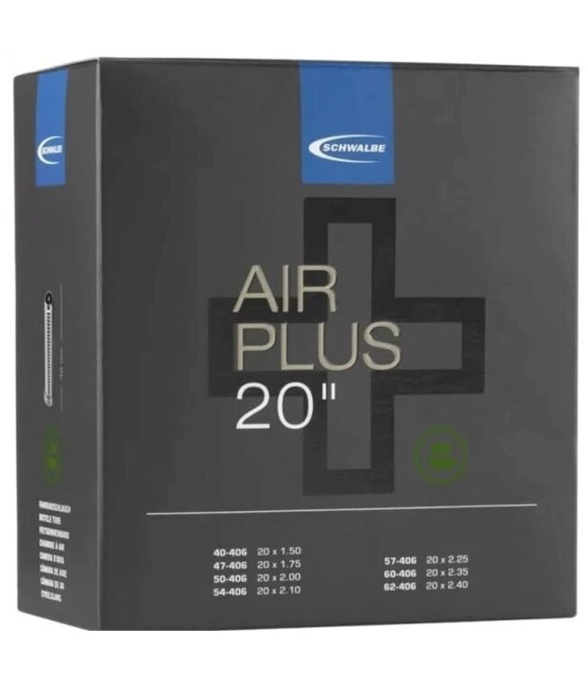 Schwalbe binnenband Air Plus 20 inch, 20 x 1.50 – 2.40 / 40/62-406 met een auto ventiel van 40mm. Door het hoge zuivere butylaandeel houdt de Schwalbe Air Plus binnenband de lucht beduidend langer vast. Hierdoor hoeft minder vaak bijgepompt te worden. Hogere lekbescherming dankzij de dikkere wandsterkte is de Schwalbe Air Plus bijzonder robuust en daardoor zeer goed beschermd tegen lekrijden. Wanneer de Schwalbe Air Plus alsnog vervangen moet worden is deze evenals alle andere Schwalbe binnenbanden 100% recyclebaar. Ideaal voor E-Bike en Cargo bikes.
