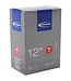 Schwalbe binnenband Standaard 12 Inch Frans - SV1/47-203, 50-203, 54-203, 62-203.De Schwalbe binnenbanden zijn betrouwbaar. Fietsdetaillisten waarderen hem om zijn hoge betrouwbaarheid. Iedere band wordt in de fabriek opgepompt en zo 24 uur op luchtdichtheid getest. De band houdt de luchtdruk langer vast. In de productie vereist Schwalbe een zeer hoog butyl aandeel en een zeer hoge reinheid van het materiaal. Zo houdt de Schwalbe binnenband de luchtdruk beduidend langer vast dan andere binnenbanden. Het is een groepen-binnenbandsysteem: Een Schwalbe binnenband is extreem elastisch en past op meerdere bandafmetingen. Hierdoor worden ze groepen binnenbanden genoemd. Zo past bijvoorbeeld de binnenband met nummer 19A voor bandafmeting van 27.5 inch tot 29 Inch en voor de breedte van 40 tot 62mm. Als laatste is de band 100% volledig recyclebaar. Standaarduitvoering: Hoge betrouwbaarheid, al vele jaren beproefd.