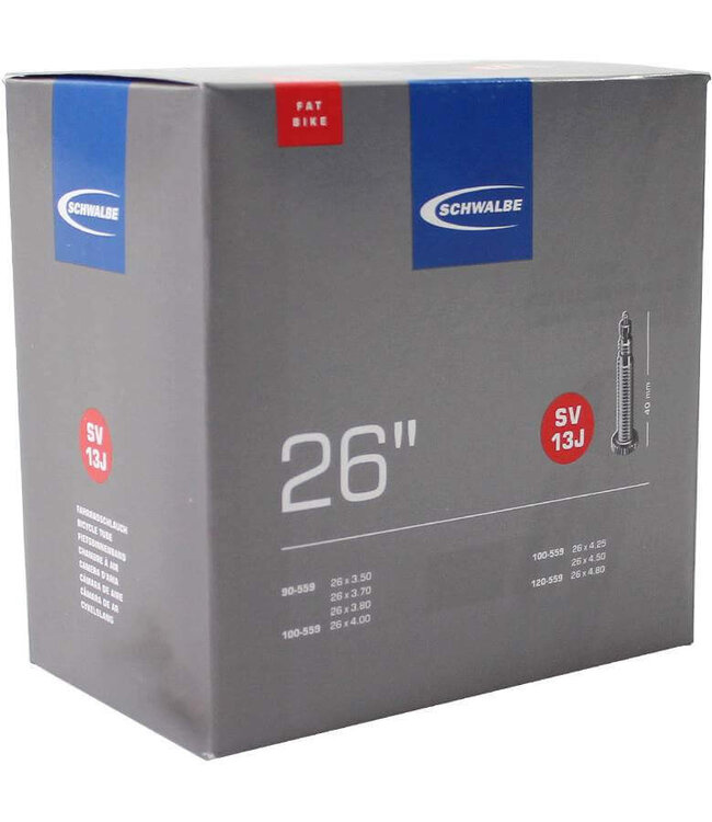 Schwalbe binnenband Fatbike 26 Inch Frans - SV13J/90-559, 100-559, 110-559, 120-559. De Schwalbe binnenbanden zijn betrouwbaar. Fietsdetaillisten waarderen hem om zijn hoge betrouwbaarheid. Iedere band wordt in de fabriek opgepompt en zo 24 uur op luchtdichtheid getest. De band houdt de luchtdruk langer vast. In de productie vereist Schwalbe een zeer hoog butyl aandeel en een zeer hoge reinheid van het materiaal. Zo houdt de Schwalbe binnenband de luchtdruk beduidend langer vast dan andere binnenbanden. Het is een groepen-binnenbandsysteem: Een Schwalbe binnenband is extreem elastisch en past op meerdere bandafmetingen. Hierdoor worden ze groepen binnenbanden genoemd. Zo past bijvoorbeeld de binnenband met nummer 19A voor bandafmeting van 27.5 inch tot 29 Inch en voor de breedte van 40 tot 62mm. Als laatste is de band 100% volledig recyclebaar. Speciaal voor de Fatbike.