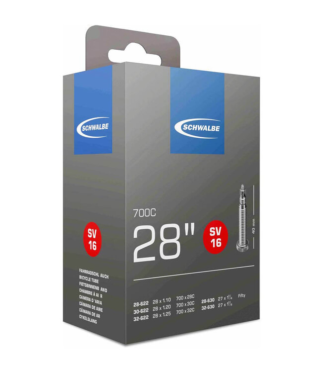 Schwalbe binnenband Smal 28 Inch Frans - SV16/28-622, 30-622, 32-622, 28-630, 32-630. De Schwalbe binnenbanden zijn betrouwbaar. Fietsdetaillisten waarderen hem om zijn hoge betrouwbaarheid. Iedere band wordt in de fabriek opgepompt en zo 24 uur op luchtdichtheid getest. De band houdt de luchtdruk langer vast. In de productie vereist Schwalbe een zeer hoog butyl aandeel en een zeer hoge reinheid van het materiaal. Zo houdt de Schwalbe binnenband de luchtdruk beduidend langer vast dan andere binnenbanden. Het is een groepen-binnenbandsysteem: Een Schwalbe binnenband is extreem elastisch en past op meerdere bandafmetingen. Hierdoor worden ze groepen binnenbanden genoemd. Zo past bijvoorbeeld de binnenband met nummer 19A voor bandafmeting van 27.5 inch tot 29 Inch en voor de breedte van 40 tot 62mm. Als laatste is de band 100% volledig recyclebaar. Standaarduitvoering: Hoge betrouwbaarheid, al vele jaren beproefd.