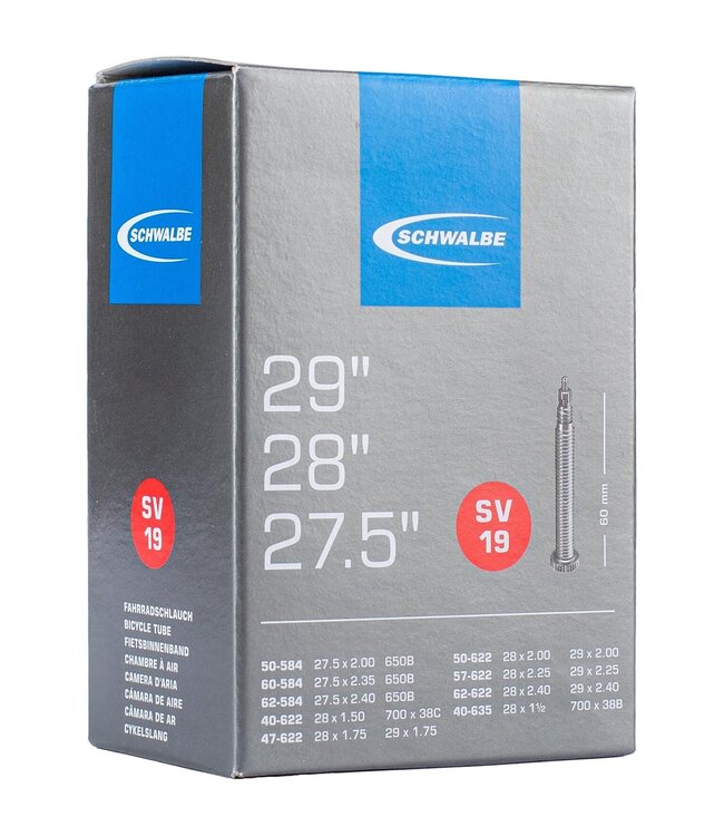 Schwalbe binnenband Standaard 28x1.75 Frans - SV19/50-584, 60-584, 62-584, 40-622, 47-622, 50-622, 57-622, 62-622, 40-635. De Schwalbe binnenbanden zijn betrouwbaar. Fietsdetaillisten waarderen hem om zijn hoge betrouwbaarheid. Iedere band wordt in de fabriek opgepompt en zo 24 uur op luchtdichtheid getest. De band houdt de luchtdruk langer vast. In de productie vereist Schwalbe een zeer hoog butyl aandeel en een zeer hoge reinheid van het materiaal. Zo houdt de Schwalbe binnenband de luchtdruk beduidend langer vast dan andere binnenbanden. Het is een groepen-binnenbandsysteem: Een Schwalbe binnenband is extreem elastisch en past op meerdere bandafmetingen. Hierdoor worden ze groepen binnenbanden genoemd. Zo past bijvoorbeeld de binnenband met nummer 19A voor bandafmeting van 27.5 inch tot 29 Inch en voor de breedte van 40 tot 62mm. Als laatste is de band 100% volledig recyclebaar. Standaarduitvoering: Hoge betrouwbaarheid, al vele jaren beproefd.