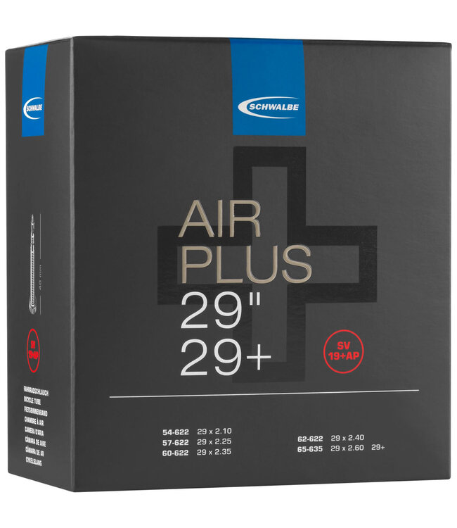 Schwalbe binnenband Air Plus 29 inch 54/62-622 Frans ventiel, houdt langer de lucht vast, Door het hoge zuivere butylaandeel houdt de Schwalbe Air Plus binnenband de lucht beduidend langer vast. Hierdoor hoeft minder vaak bijgepompt te worden. hogere lekbescherming Dankzij de dikkere wandsterkte is de Schwalbe Air Plus bijzonder robuust en daardoor zeer goed beschermd tegen lekrijden. Wanneer de Schwalbe Air Plus alsnog vervangen moet worden is deze evenals alle andere Schwalbe binnenbanden 100% recyclebaar. Ideaal voor E-Bike en Cargo bikes.