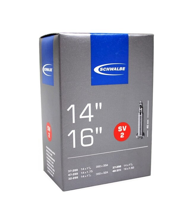 Schwalbe binnenband Standaard 14 Inch Frans - SV2/37-288, 47-588, 32-298, 37-298, 40-305. De Schwalbe binnenbanden zijn betrouwbaar. Fietsdetaillisten waarderen hem om zijn hoge betrouwbaarheid. Iedere band wordt in de fabriek opgepompt en zo 24 uur op luchtdichtheid getest. De band houdt de luchtdruk langer vast. In de productie vereist Schwalbe een zeer hoog butyl aandeel en een zeer hoge reinheid van het materiaal. Zo houdt de Schwalbe binnenband de luchtdruk beduidend langer vast dan andere binnenbanden. Het is een groepen-binnenbandsysteem: Een Schwalbe binnenband is extreem elastisch en past op meerdere bandafmetingen. Hierdoor worden ze groepen binnenbanden genoemd. Zo past bijvoorbeeld de binnenband met nummer 19A voor bandafmeting van 27.5 inch tot 29 Inch en voor de breedte van 40 tot 62mm. Als laatste is de band 100% volledig recyclebaar. Standaarduitvoering: Hoge betrouwbaarheid, al vele jaren beproefd.