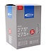 Schwalbe binnenband Freeride 27.5x2.50 Frans - SV21F/54-584, 57-584, 60-584, 62-584, 65-584, 70-584, 75-584. De Schwalbe binnenbanden zijn betrouwbaar. Fietsdetaillisten waarderen hem om zijn hoge betrouwbaarheid. Iedere band wordt in de fabriek opgepompt en zo 24 uur op luchtdichtheid getest. De band houdt de luchtdruk langer vast. In de productie vereist Schwalbe een zeer hoog butyl aandeel en een zeer hoge reinheid van het materiaal. Zo houdt de Schwalbe binnenband de luchtdruk beduidend langer vast dan andere binnenbanden. Het is een groepen-binnenbandsysteem: Een Schwalbe binnenband is extreem elastisch en past op meerdere bandafmetingen. Hierdoor worden ze groepen binnenbanden genoemd. Zo past bijvoorbeeld de binnenband met nummer 19A voor bandafmeting van 27.5 inch tot 29 Inch en voor de breedte van 40 tot 62mm. Als laatste is de band 100% volledig recyclebaar. Freeride-uitvoering: Groot volume, gering gewicht.
