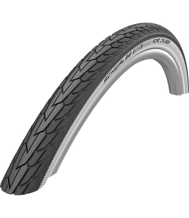 Schwalbe buitenband Road Cruiser Zwart/Wit 26x1.75/47-559. Urban, individueel en dynamisch. De Road Cruiser maakt indruk met zijn aangename profieldesign en de ruime keuze aan kleuren voor fietsen van 12 inch tot 28 inch. Het meest opvallende kenmerk van de Road Cruiser zit op het loopvlak en heet Green Compound. Een rubber, gemaakt uit hernieuwbaar en gerecycled ruw materiaal, dat zo goed is dat het voor het eerst gebruikt kan worden in een conventionele band. Green Compound is uitsluitend in de zwarte versie verkrijgbaar.
