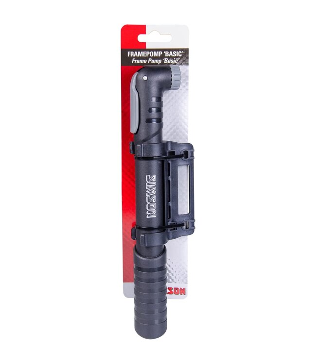 De Simson Framepomp Exellent is een compacte pomp met grote pompkracht voor ieder ventiel. Door de telescoop techniek pompt u bij iedere pompslag bijna het dubbele aan lucht in een band ten opzichte van een gewone framepomp zonder deze techniek. De Simson Framepomp Exellent heeft een handig uitklapbaar handvat wat zorgt voor extra pompcomfort. Door de slimme dubbele pompkop is de pomp direct klaar voor ieder ventiel. Zet de Simson Framepomp ‘Exellent’ met de juiste kant van de pompkop op het ventiel en draai de kunststof sluiting een kwartslag richting het ventiel. Vervolgens kan de band worden opgepompt tot de juiste spanning is bereikt. Draai daarna de kunststof sluiting weer een kwartslag terug van het ventiel en haal de pompkop van het ventiel af. De Simson Framepomp ‘Exellent’ wordt geleverd met handige framehouder en bevestigingsmaterialen.