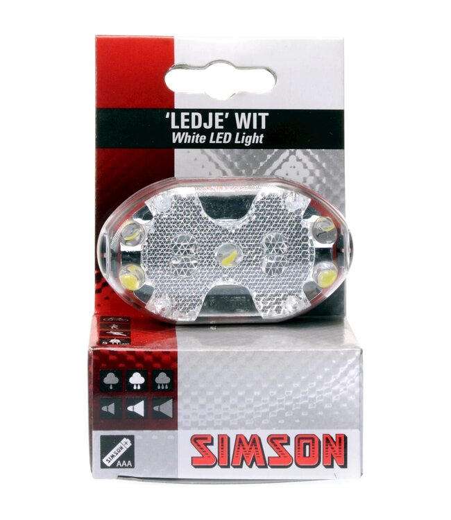 Simson Batterij voorlicht met 5 witte led s en handige aan/uit knop. Klik het voorlicht eenvoudig vast aan een riem of monteer deze met behulp van een kruiskopschroevendraaier en de meegeleverde bevestigingsring op de zadelpen. Het fietslampje kan vervolgens eenvoudig in en uit de bevestigingsring worden geklikt. Inclusief 2 x AAA batterijen.