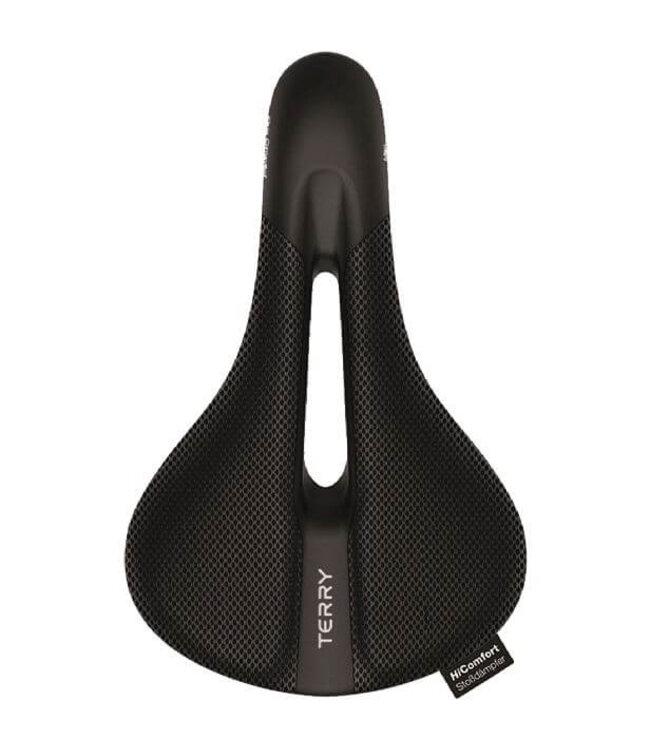 Terry zadel Fisio Climavent gel Heren zwart, Zitbreedte 9-12cm, Dempingsmateriaal: Comfort foam-schuim. Het slanke ontwerp in het midden en de zadelneus zorgt dat op een prettige manier van zitpositie kan worden gewisseld. Speciaal ontwikkeld voor een iets meer rechtop zitpositie, waarbij een groter deel van het lichaamsgewicht op de zitbotten steunt. Bijzonder effectieve rugbescherming dankzij het zeer efficiente Cellasto-dempingssysteem, dat is ontwikkeld en geproduceerd in samenwerking met BASF in Duitsland. Ideaal voor langeafstandsritten en toertochten. Fietsers op toer- of stadsfietsen dragen meestal geen speciale fietsbroek, maar gewone kleding met ondergoed en zitten over het algemeen op zadels die niet luchtdoorlatend zijn. Bovendien zitten ze veel in het zadel en veranderen ze nauwelijks van houding. De warmte hoopt zich op met duidelijk meer zitzweet als gevolg - duidelijk meer dan bij wielrenners of mountainbikers, ondanks dat zij zich lichamelijk veel meer inspannen. Omdat het zadel het zweet niet op kan nemen, wordt het zadeloppervlak vochtig. Het open textiel van het ClimaVent-membraan zorgt voor een permanente luchtlaag tussen het lichaam en het zadeloppervlak en staat zodoende garant voor een uitgebalanceerde temperatuur en een comfortabel zitklimaat. Dankzij de micro-fijne onderkant van het membraan is het zadel waterafstotend. Na regen is het oppervlak dan ook binnen een paar minuten alweer droog. Zadel is ook geschikt voor Terry QuickClick-zadeltassen.