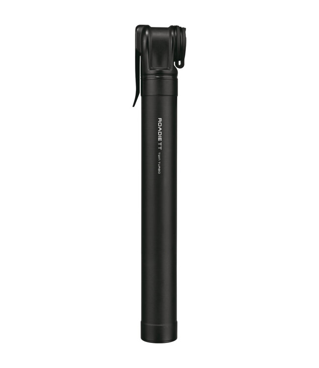 Topeak Minipomp Roadie TT. De Roadie TT Twin Turbo is een compacte, volledig metalen minipomp die een groot luchtvolume in een grote buitenkamer naar een kleinere binnenkamer perst zodat er meer lucht met een hogere druk in de band wordt gepompt. Daardoor kun je 50% sneller en gemakkelijker je banden oppompen. De geintegreerde stofdop houdt de pompkop schoon terwijl de blokkeerhendel met duimbediening zorgt voor een verliesvrije aansluiting met het ventiel. Gewicht: 100g. Volume per slag: 41,4 cc. Afmeting: 19,5x3,3x2,35cm. Materiaal: Aluminium. Capaciteit: 160 psi - 11 bar. Kleur: Zwart. TRTT-2B