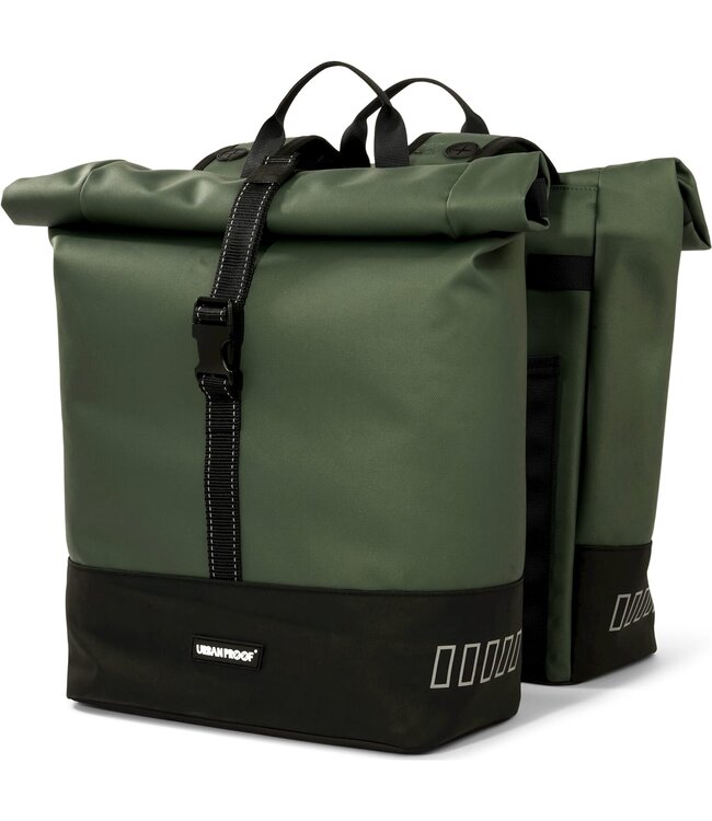 De Double Rolltop tas is de perfecte mix van strak en modern design, met een handige oprolbare sluiting die met een gesp vastklikt. Bevestig deze tas moeiteloos op je fiets en laat het gewicht van je spullen niet langer je rit verpesten. Dankzij de rolltop heb je altijd voldoende flexibiliteit in volume, terwijl je spullen veilig en beschermd blijven opgeborgen. Deze tas is gemaakt voor de gedreven Commuter die houdt van ruimte en een mooi ontwerp, maar ook begaan is met onze planeet. Hij is namelijk gemaakt van maar liefst 62 gerecyclede PET-flessen van 500ML. Ga voor deze edgy tas en maak een statement! E-Bike compatibel, MIK-systeemvriendelijk, waterbestendig en reflectie op de achterkant