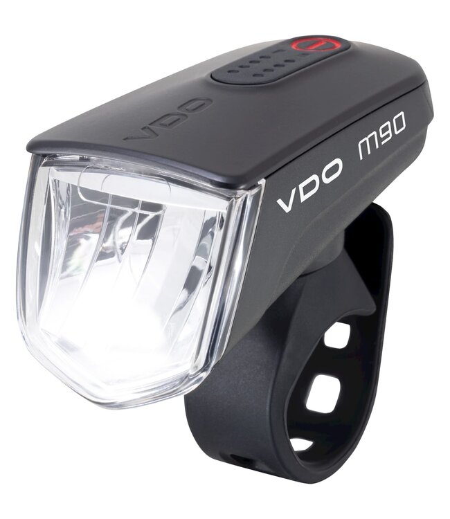 VDO Eco Light M90 FL USB koplamp LED 90 Lux - incl. geint. Li-ion accu + Micro-USB kabel, De M90 is de keuze beste keuze voor forensen of voor al je sportieve avondritten op de racefiets. Met de sterke 90 lux LED en een lichtbundel van wel 110 m zorgt deze koplamp ervoor dat je altijd goed zicht hebt, ook op de paden op de gravelbike. Een nieuwe feature zijn de LED-indicatoren aan de bovenkant welke exact aangeven hoeveel accucapaciteit er nog over is en in welke van de vier verlichtingsmodi je rijdt, wel zo handig. Deze verlichting beschikt over het RAI Keurmerk Fietsverlichting (RKF) en de Duitse StVZO wettelijke goedkeuringen.